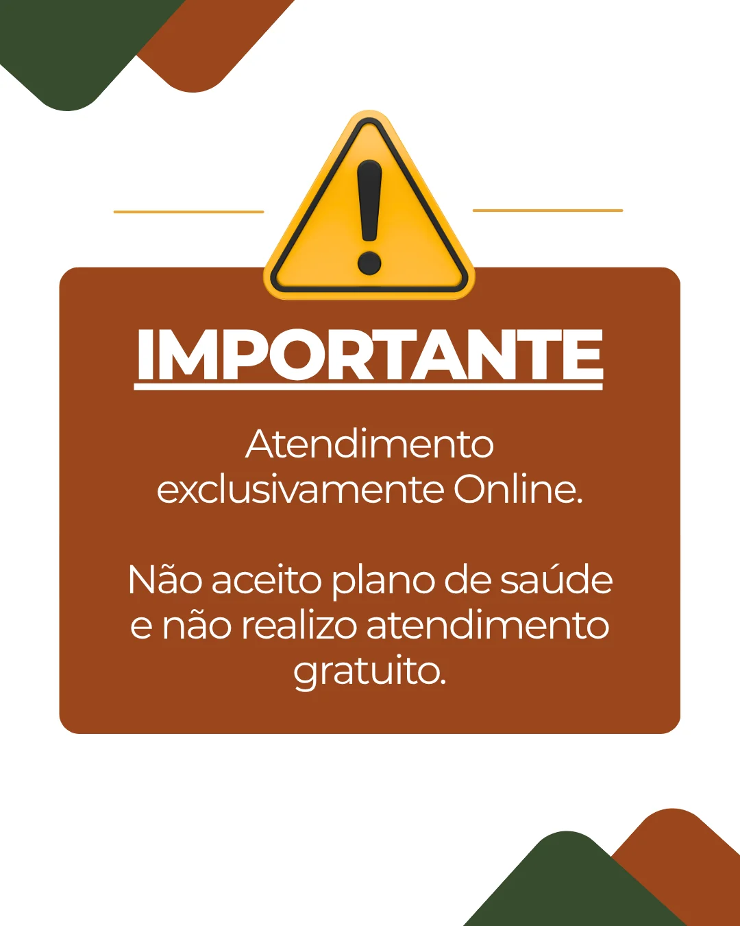 Não atendo convênios, somente particular, com emissão de nota fiscal para imposto de renda ou solicitação de reembolso por parte do seu plano de saúde (se houver esta opção no seu caso)